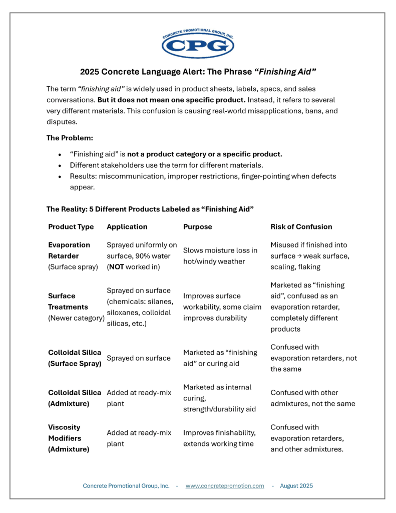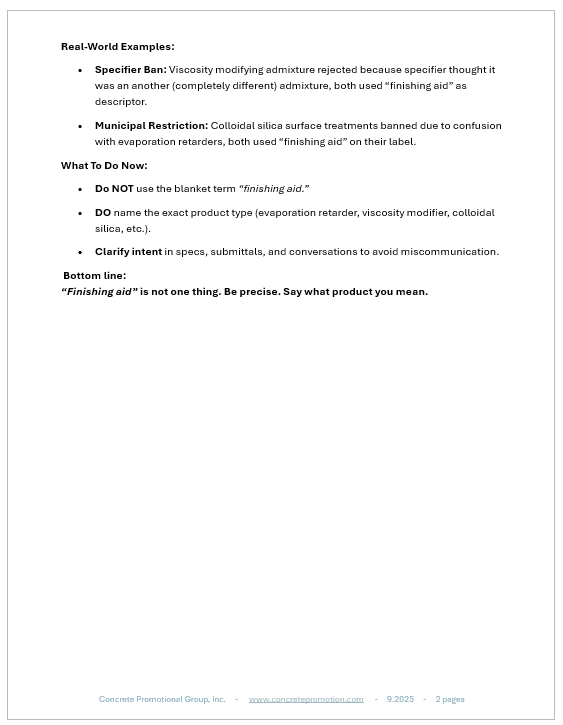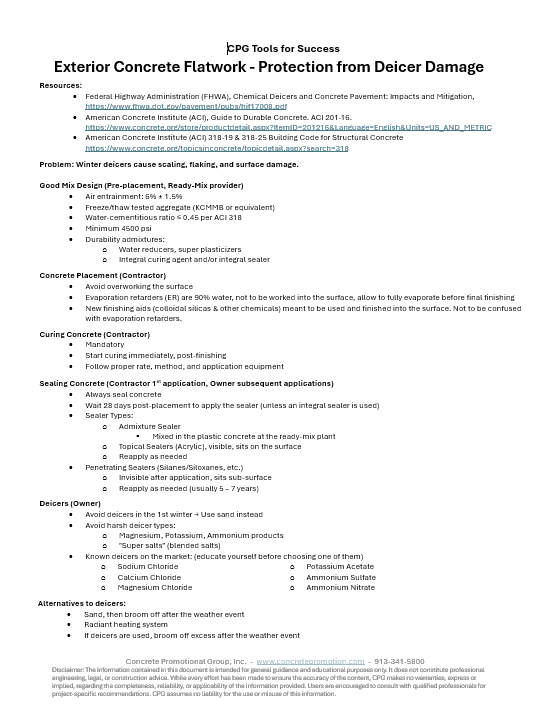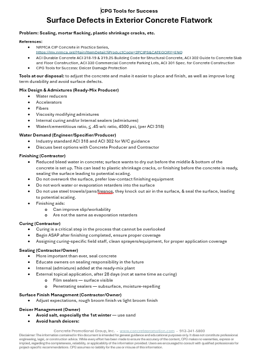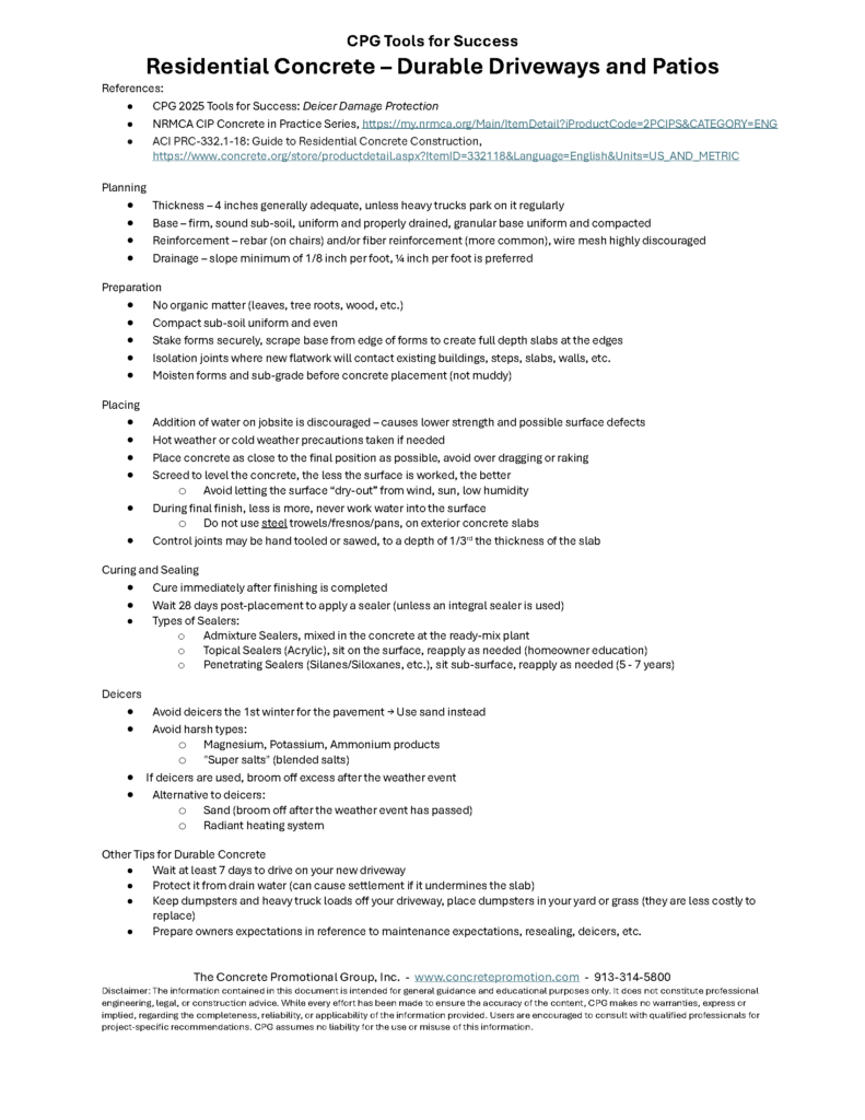 Educational Posters Technical Tools for Success Page 1 Page 2 Download a PDF Exterior Concrete Flatwork - Protection from Deicer Damage Guidelines for Residential Concrete - Building Durable Driveways and Patios Surface Defects in Exterior Concrete Flatwork Concrete Language Alert - Finishing Aids